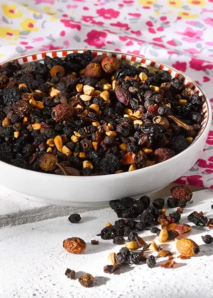 OKAPI Vier Seizoenenvoer Winterkruiden bevat: 100% kruidenmengsel, bevat: hooi-bloem, haverstro, malvebloesem, wilde zadenmix (bevat: vlasdotter, chia, rozenbottelzaden, zwarte komijn, teunisbloemzaden, blauwe maanzaad, perilla, kardoen), karwij, aroniabes, braambladeren, herderstasje, vlierbessen, heidekruid, bosbessenbladeren, meidoornbessen, anijs, lapacho, bittere venkel, zonnehoedkruid, meidoornbladeren, pastinaak, ginkgobladeren, kaneel.